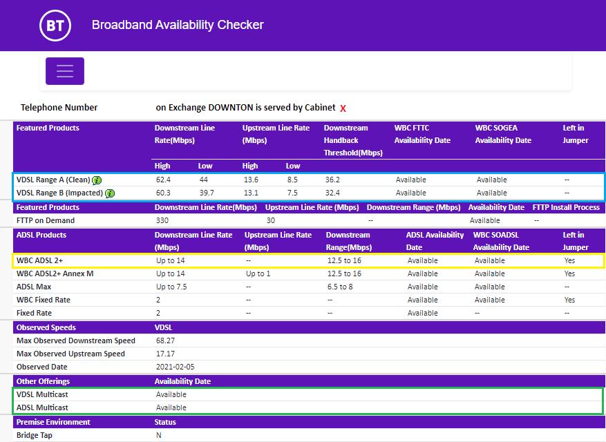 The figures in the blue box are for the Fibre to the Cabinet, in the yellow box are for a copper service and those in green must be enabled if you want to reliably receive streaming TV over BT. The red X at the top shows what Cabinet you are connected to.
