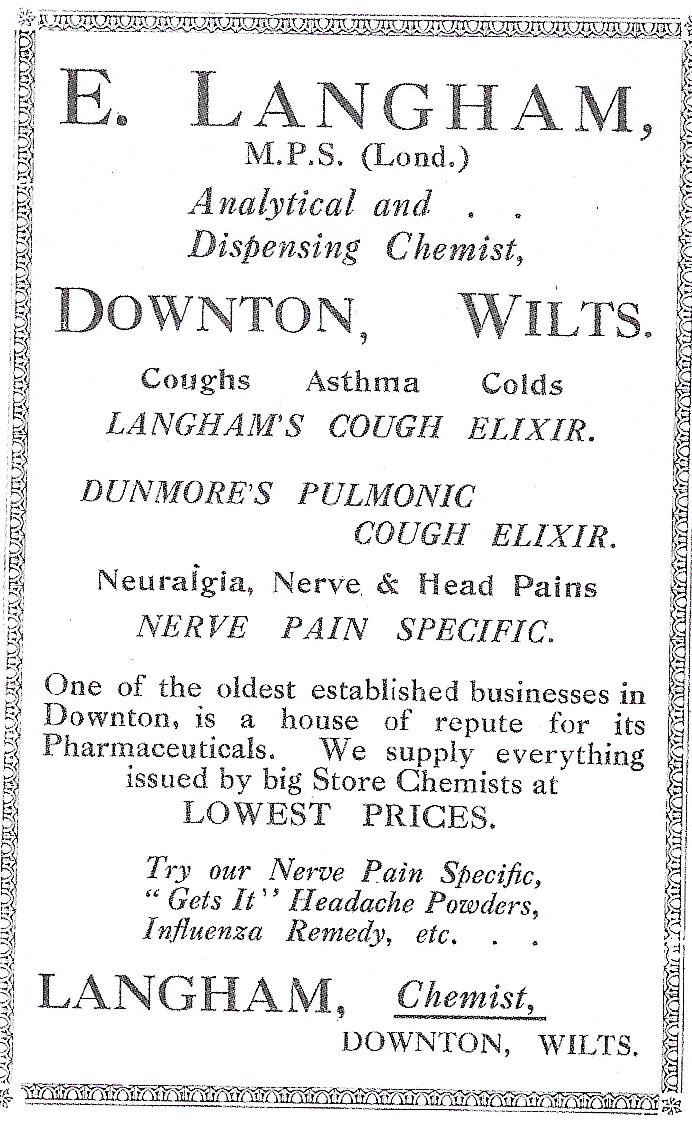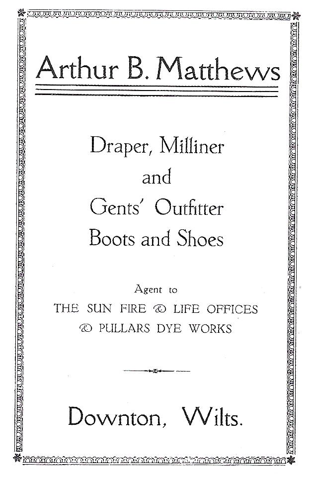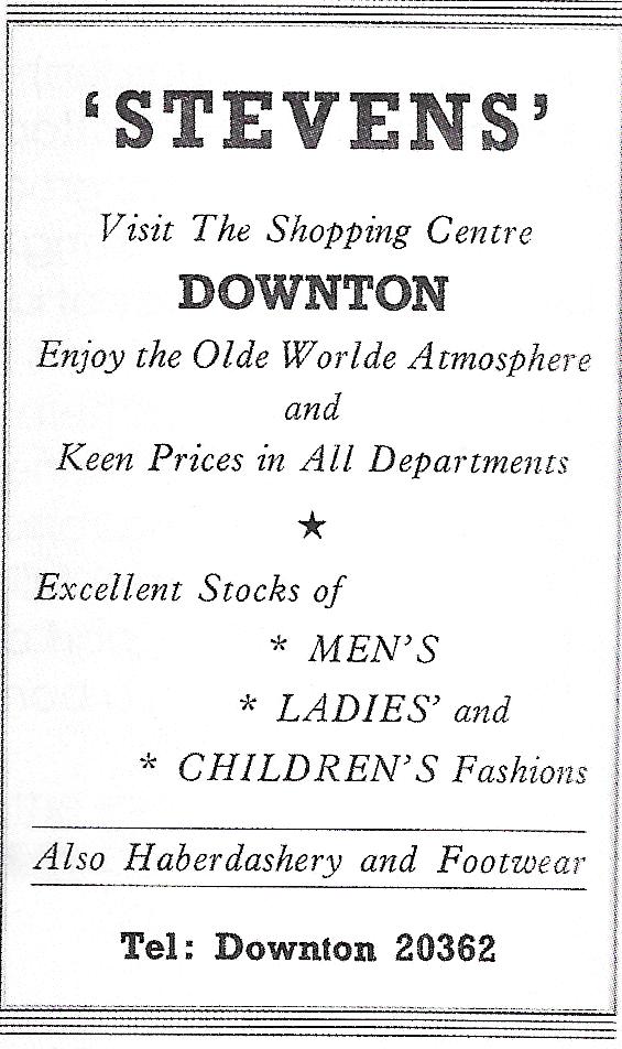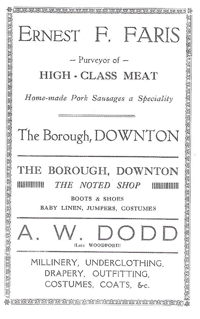 The shops leading into Church Hatch have been occupied by some famous Downton trading names, including Arthur Matthews and Sydney Stevens (both drapers), and J R Bowskill (chemists). The advertisement to the right is dated circa 1930.