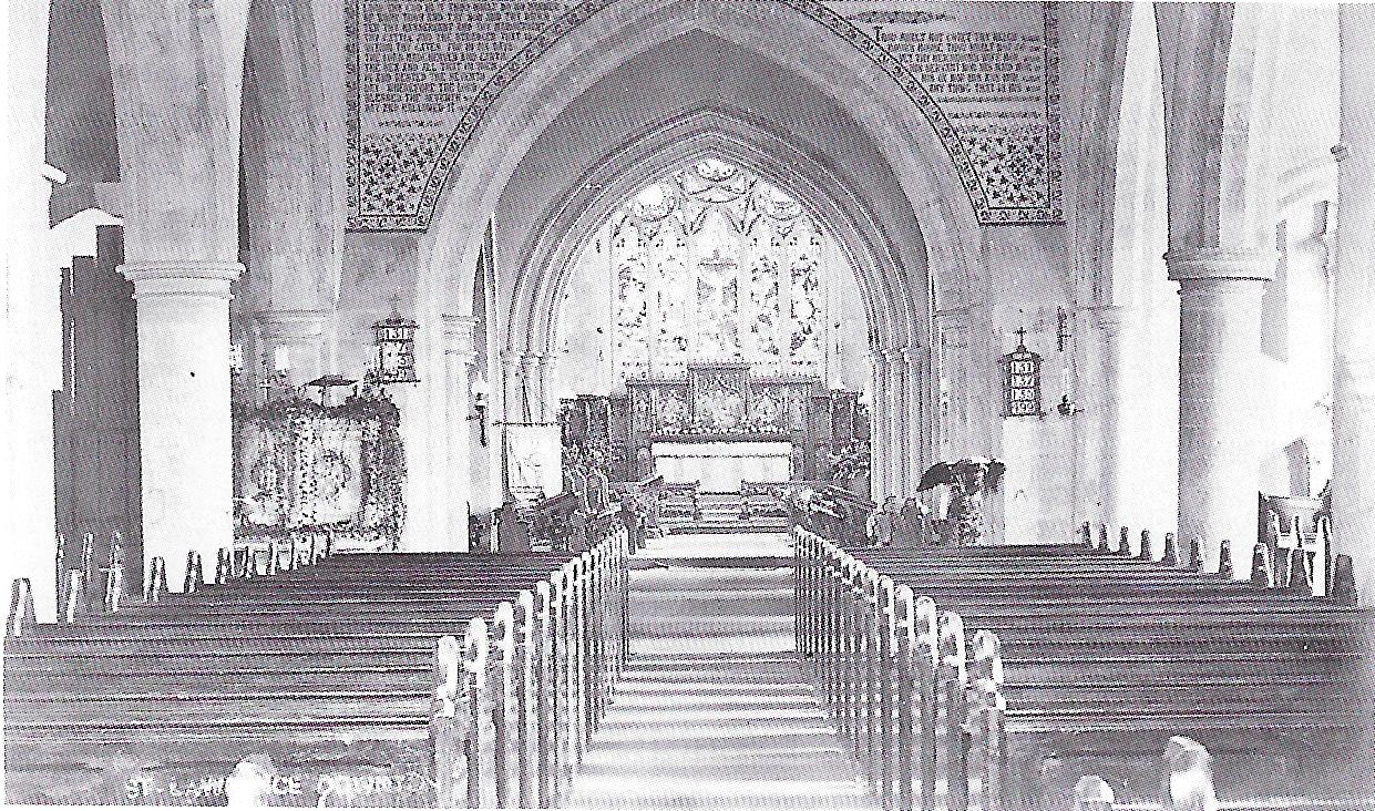 Much work was also carried out on the chancel which, until this time, had been separated from the nave by a wall, having been used by the Bishops of Winchester as a chapel when visiting Downton. The west gallery of 1734 and the vestry were removed at this time. Further works in 1890-9l included the replastering of the interior and new tracery in the west window. The nave of the church is pictured below circa 1910.