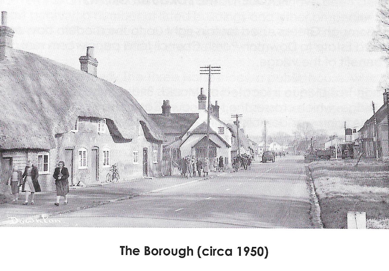 On the northern side of The Borough, between Moulds Bridge and Gravel Close is a row of shop premises built on the former site of a row of thatched cottages. The bricked up fireplace of one of the cottages - which had been occupied by Fanny Pretty - can be seen in the end wall of 51 The Borough (Cymbeline), to the left of the forecourt of the shops. Number 51 also has a Victorian letter box in its wall and was formerly partly used as a shop belonging to Mr and Mrs Newman, who also ran a café on the site of the modern houses at 49A and 49B The Borough.
