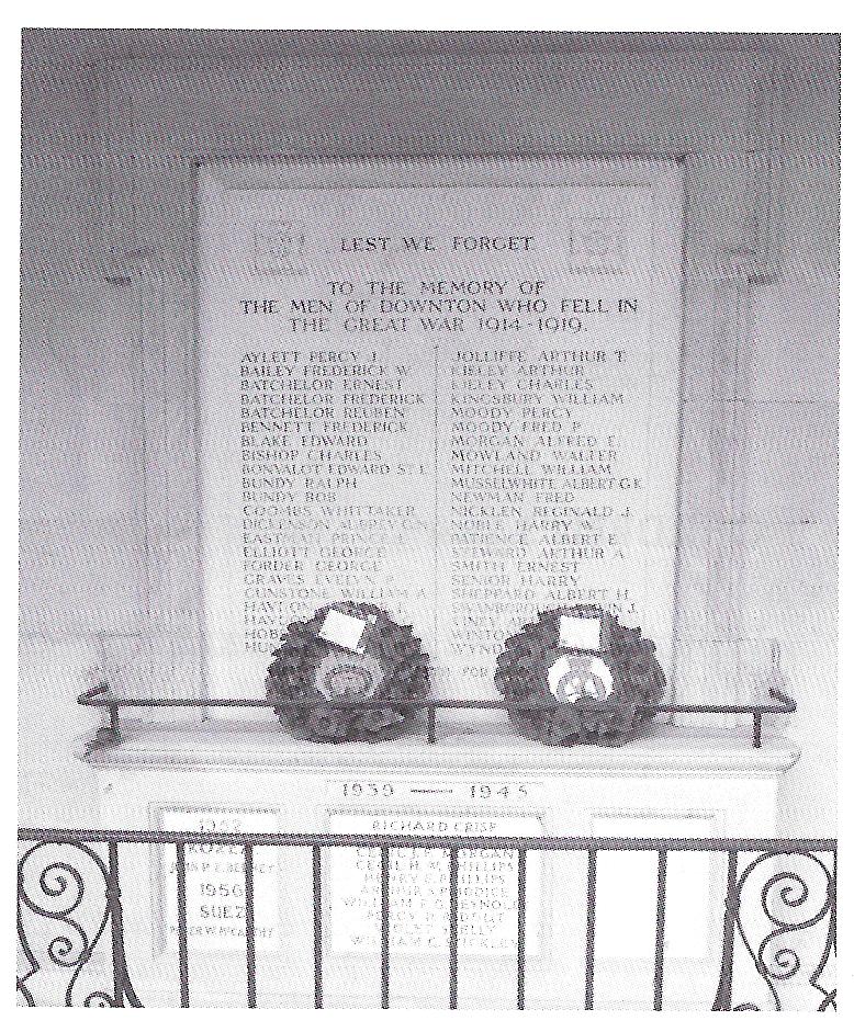 In the churchyard there is a medieval cross on a raised base to the south east of the porch. There are eight bells at the church. The oldest is dated 1605 and the most recent was added to mark the blessing of bread and wine in 1996. On the south wall of the church a leper window and marks from a doorway where the village fire engine was once kept can still be seen. The fire engine can now be seen in Salisbury and South Wiltshire Museum. Downton’s Reverend Dickenson served as Senior Chaplain to the Forces during World War One. His son, Aubrey Dickenson, died on 1 July 1916 of wounds he received on that date - the first day of the Somme. By cruel coincidence, Whittaker Coombs - the son of the village’s Baptist Minister,died on the following day of wounds received at the same battle. Their names appear one after the other at the Memorial Hall (see plaque 3).